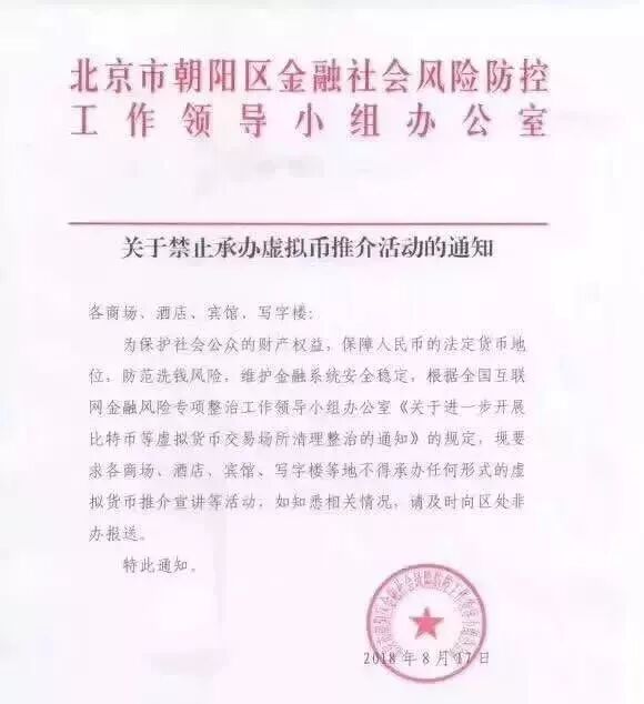 8月22日,北京市朝阳区金融社会风险防控工作领导小组办公室发布了《关于禁止承办虚拟币推介活动的通知》(下称《通知》),文件签署日期显示为8月17日。
