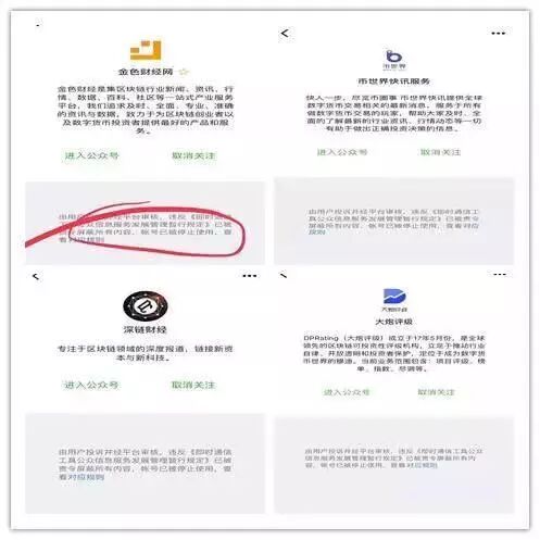 前几天晚上,一批涉区块链内容微信大号,如金色财经网、币世界快讯服务、大炮评级、TokenClub、比特吴、火币资讯、深链财经等均显示账号违反《即时通信工具公众信息服务发展管理暂行规定》,已被责令屏蔽所有内容并停止使用。