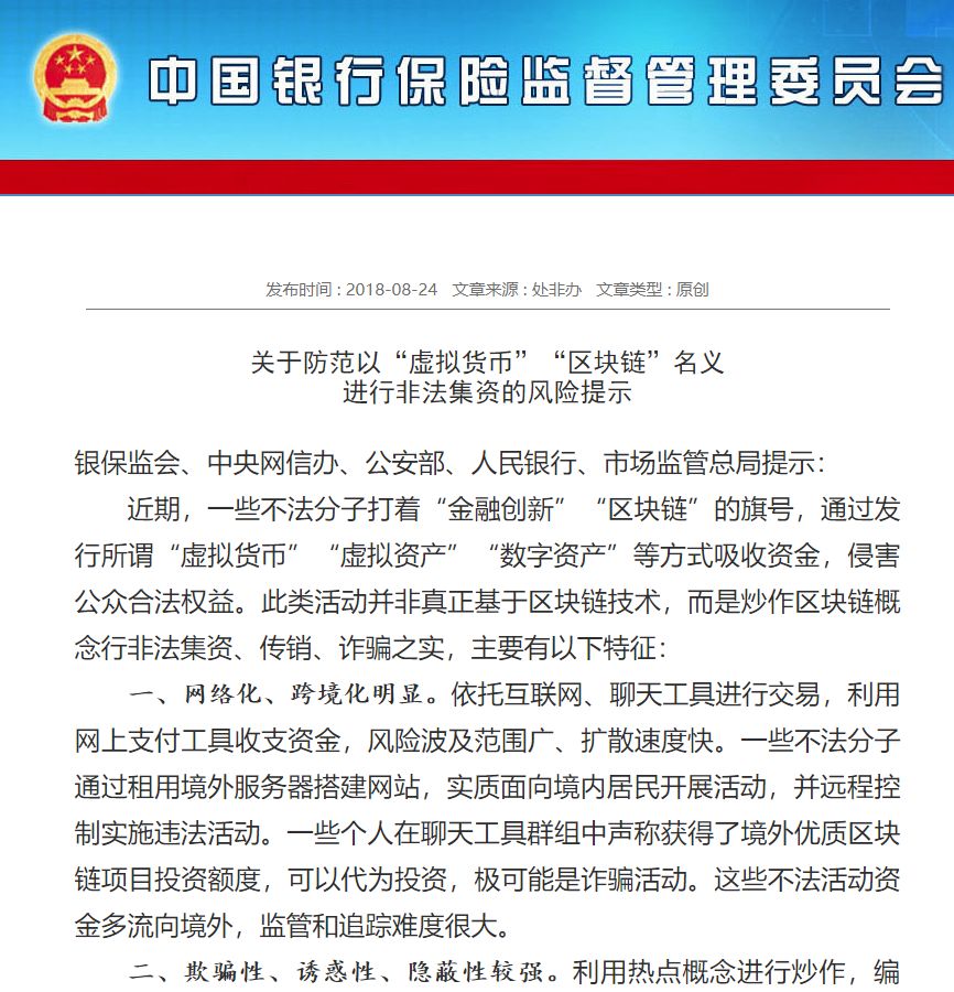 8月24日,银保监会、中央网信办、公安部、人民银行、市场监管总局发文提示:近期,一些不法分子打着“金融创新”“区块链”的旗号,通过发行所谓“虚拟货币”“虚拟资产”“数字资产”等方式吸收资金,侵害公众合法权益。此类活动并非真正基于区块链技术,而是炒作区块链概念行非法集资、传销、诈骗之实。